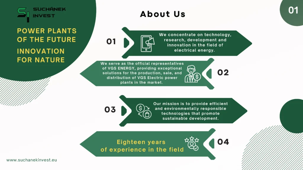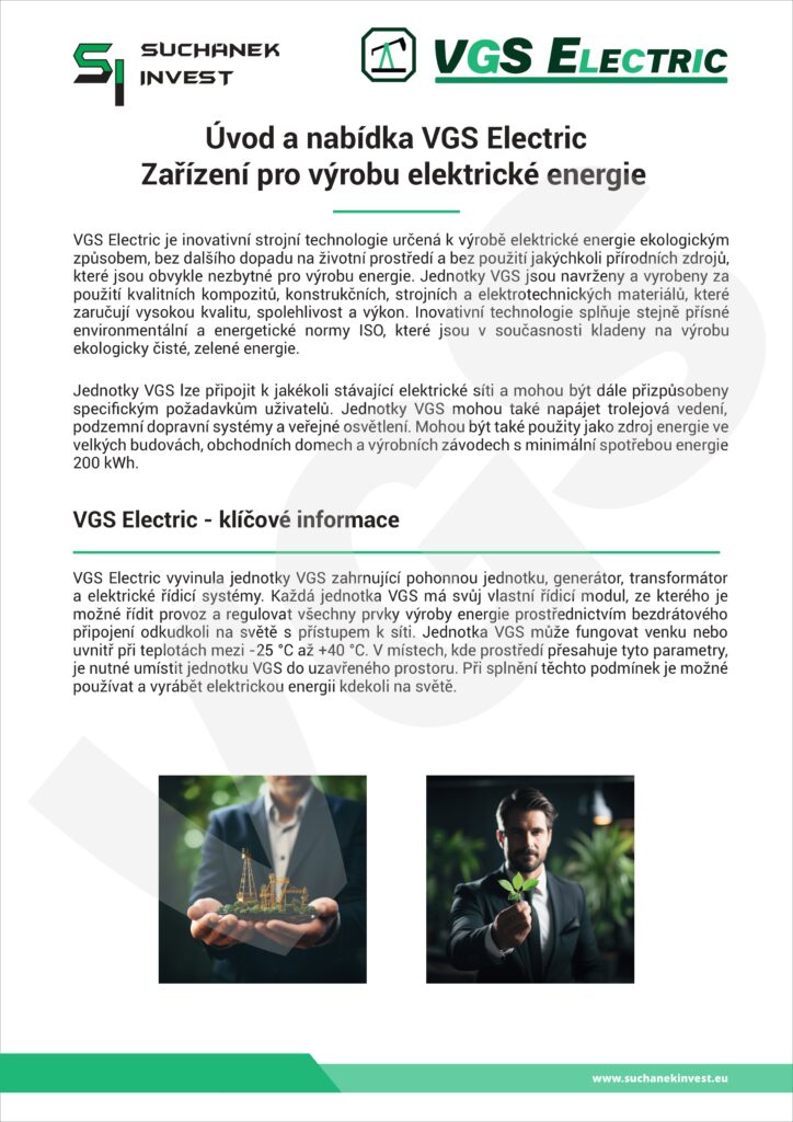 Jsme společnost zaměřená na pokročilé technologie, výzkum, vývoj a inovace v oblastech výroby elektrické energie, petrolejářství a zemědělství. Jako oficiální zástupci společnosti VGS ENERGY přinášíme na trh špičková řešení pro výrobu, prodej a distribuci elektráren VGS Electric. Naším posláním je nabízet efektivní a ekologicky odpovědné technologie, které podporují udržitelný rozvoj a zvyšují efektivitu využití zdrojů pro dlouhodobý růst.