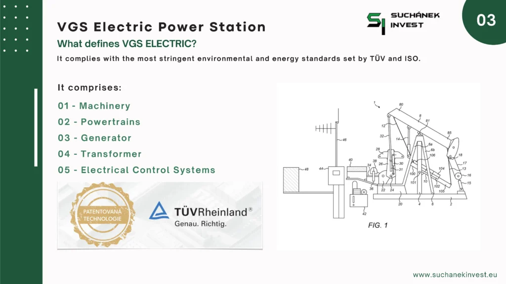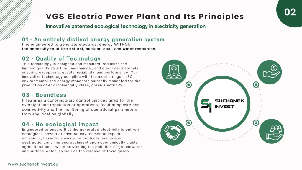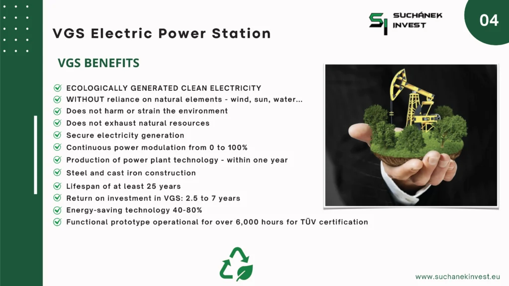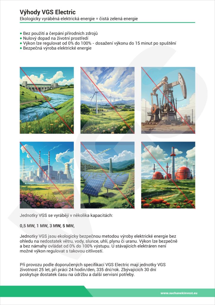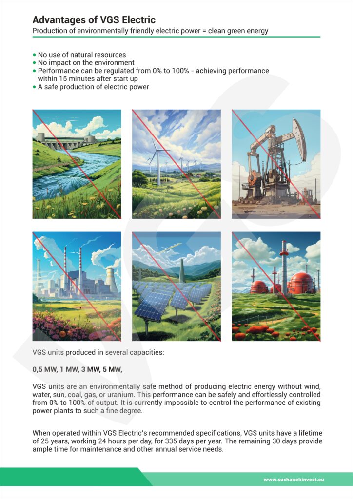 Elektrárna VGS Electric je sestrojena tak, aby vyráběná elektrická energie byla zcela ekologická, bez negativních dopadů na životní prostředí, bez emisí, bez vedlejší produkce nebezpečných odpadů, nebo ničení a devastace krajiny a zabírání jinak hospodářsky využitelné zemědelské půdy, bez znečišťování podzemních a povrchových vod a bez produkce jedovatých škodlivých plynů. Jedná se tedy o technologii, která je navržena a vyrobena z nejkvalitnějších konstrukčních, strojních a elektrotechnických materiálů, zaručujících vysokou kvalitu, spolehlivost a výkon. Námi inovovaná technologie splňuje nejpřísnější ekologické a energetické požadavky ISO, které jsou v současnosti kladeny na výrobu ekologicky čisté, zelené elektrické energie.