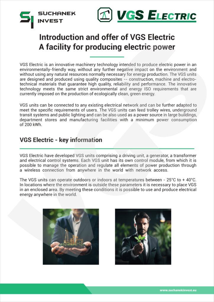 Elektrárna VGS Electric je inovovaná strojní technologie, která je určená pro výrobu elektrické energie. Tato elektrická energie je vyráběna zcela ekologickým způsobem, bez potřeby využití přírodních, jaderných, uhelných a vodních zdrojů, v současné době potřebných pro celosvětovou výrobu elektrické energie.